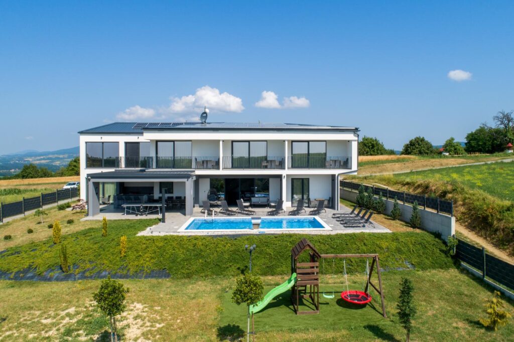 Kada je hedonizam u pitanju, njega ne nedostaje. U gornjem dijelu kuće nalazi se SPA zona s panoramskim staklima, sauna, hidromasažna kada i ležaljke, što čini vaš osobni wellness s pogledom. Vani, bazen pruža trenutke tišine, uživanja i osvježenja. Terasa s roštiljem, veliko dvorište, dječje igralište i kutak za najmlađe. Sve je osmišljeno da zadovolji potrebe suvremenog gosta. I to bez kompromisa. Vila je promišljeno oblikovana za one koji žele više od običnog odmora. Pet prostranih spavaćih soba, svaka sa svojom modernom kupaonicom, omogućuju potpunu privatnost i komfor. Veliki dnevni boravak s panoramskim staklima, blagovaonica i kuhinja otvorenog tipa pružaju slobodu kretanja i druženja, ali i dovoljno mjesta za povući se kad poželite mir. Prostor je promišljen stilski, funkcionalno i emocionalno. Sve ima svrhu i pruža udobnost, dizajnirano za uživanje. Od ambijentalne rasvjete do vrhunskih materijala koji stvaraju ugodu.