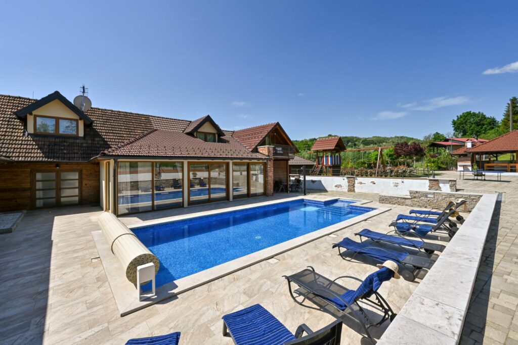 Veliki prozori uokviruju prizore valovitih brežuljaka, rascvjetanih livada i stoljetnih stabala koja se nježno njišu na povjetarcu. Interijeri, ukrašeni rustikalnim detaljima i modernim komforom, stvaraju atmosferu spokoja i sofisticiranosti, pozivajući putnike da se opuste i urone u ljepotu sela. A nude apsolutno sve, od bazena, preko saune do teniskog i nogometnog igrališta, bez obzira kakav odmor preferirate.